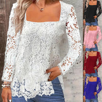 Fashion Long Sleeve Square Neck Tops Women Solid Color Floral Lace Shirt - Black / Long Sleeve / 2XL